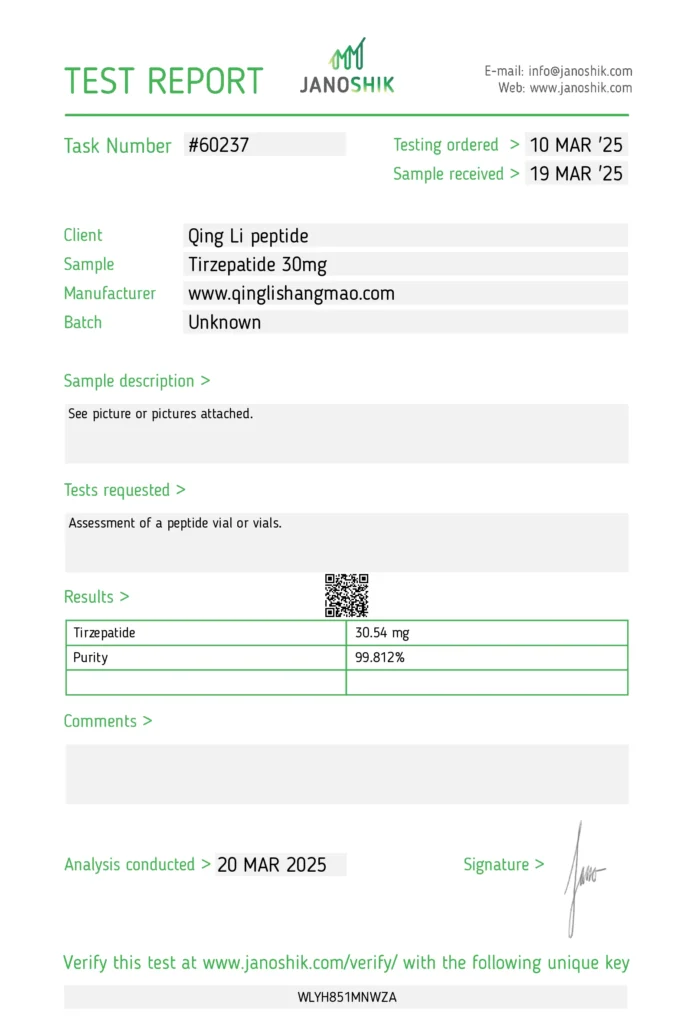 After our company’s products are produced, they are randomly sampled and sent to Janoshik laboratory for testing.